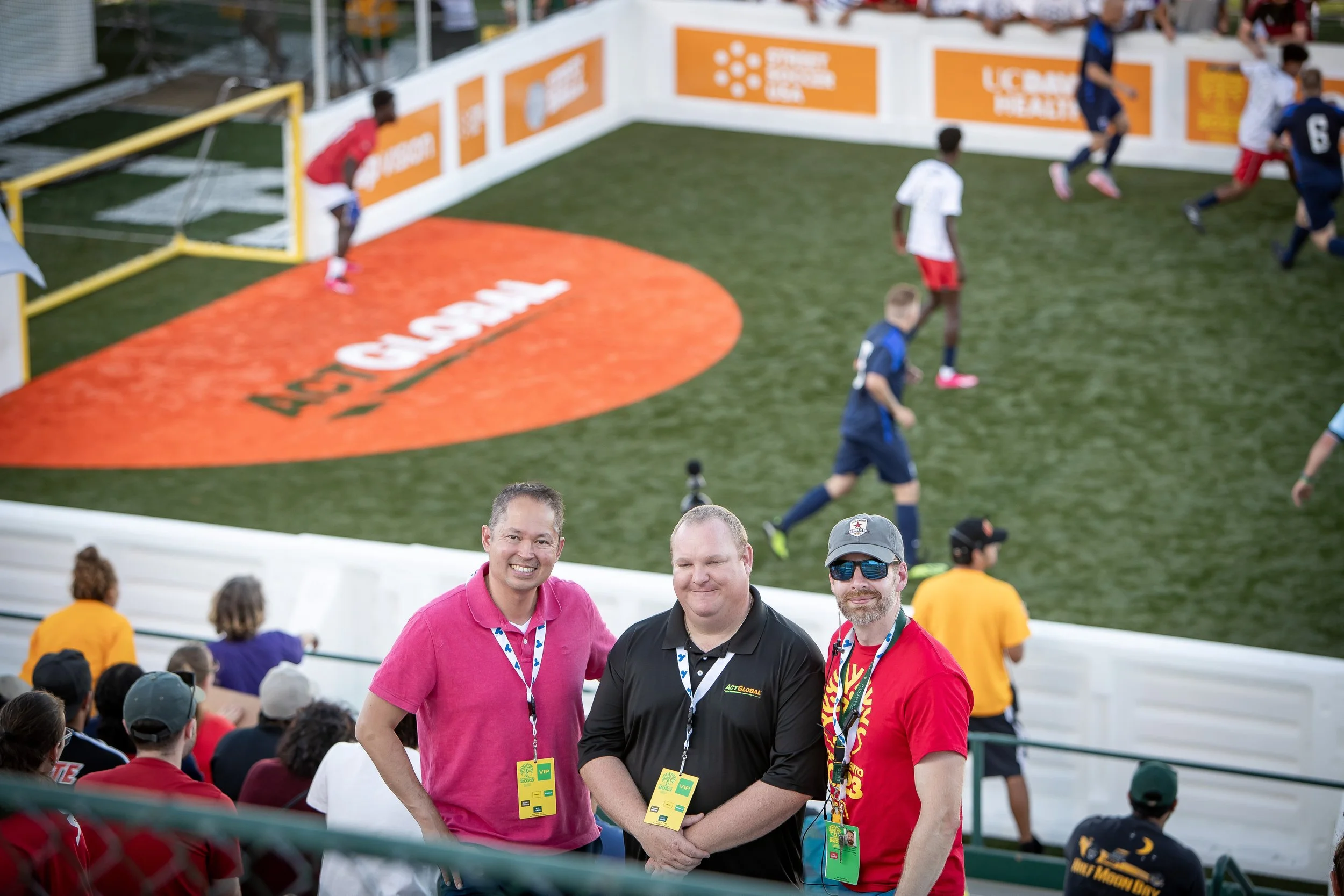 John (left) with Allen Zacharczuk from Act Global (middle) and Homeless World Cup Chief Operating Officer James McMeekin (right) at the Sacramento 2023 tournament.