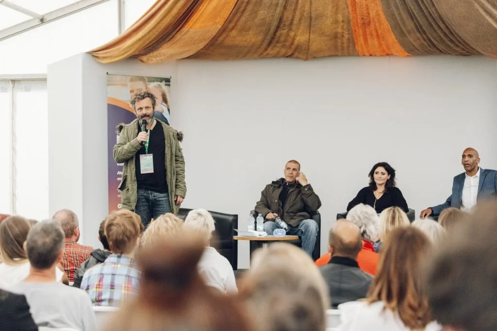 |Michael Sheen chairs an event at the Bevan Tent about the impact of wrongful conviction. Image: Mile44